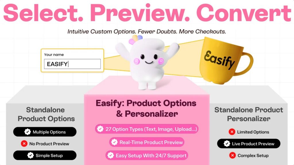 Whether you want simple dropdowns or advanced logic-based customization, Easify has it all — text boxes, color swatches, date pickers, conditional display rules, and linked product add-ons for upselling.